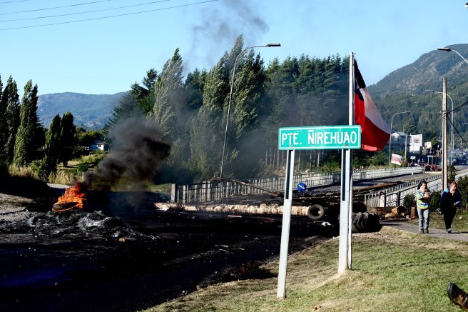Delle signore cucinano in alcuni pentoloni poggiati sui cassoni di alcuni pick–up, sono le mogli dei minatori. Ci avviciniamo al ponte che segna l’ingresso in paese, da dove arriva un denso fumo nero di copertoni bruciati. Tronchi d’albero e cavi d’acciaio sono stesi alle due estremità: il blocco non si può forzare. Tutti i minatori sono seduti a bordo strada ed hanno delle mascherine per difendersi dal fumo. Alcuni giornalisti chiacchierano attorno ad una telecamera spenta. Una bandiera del Cile sventola sopra a delle fiamme.