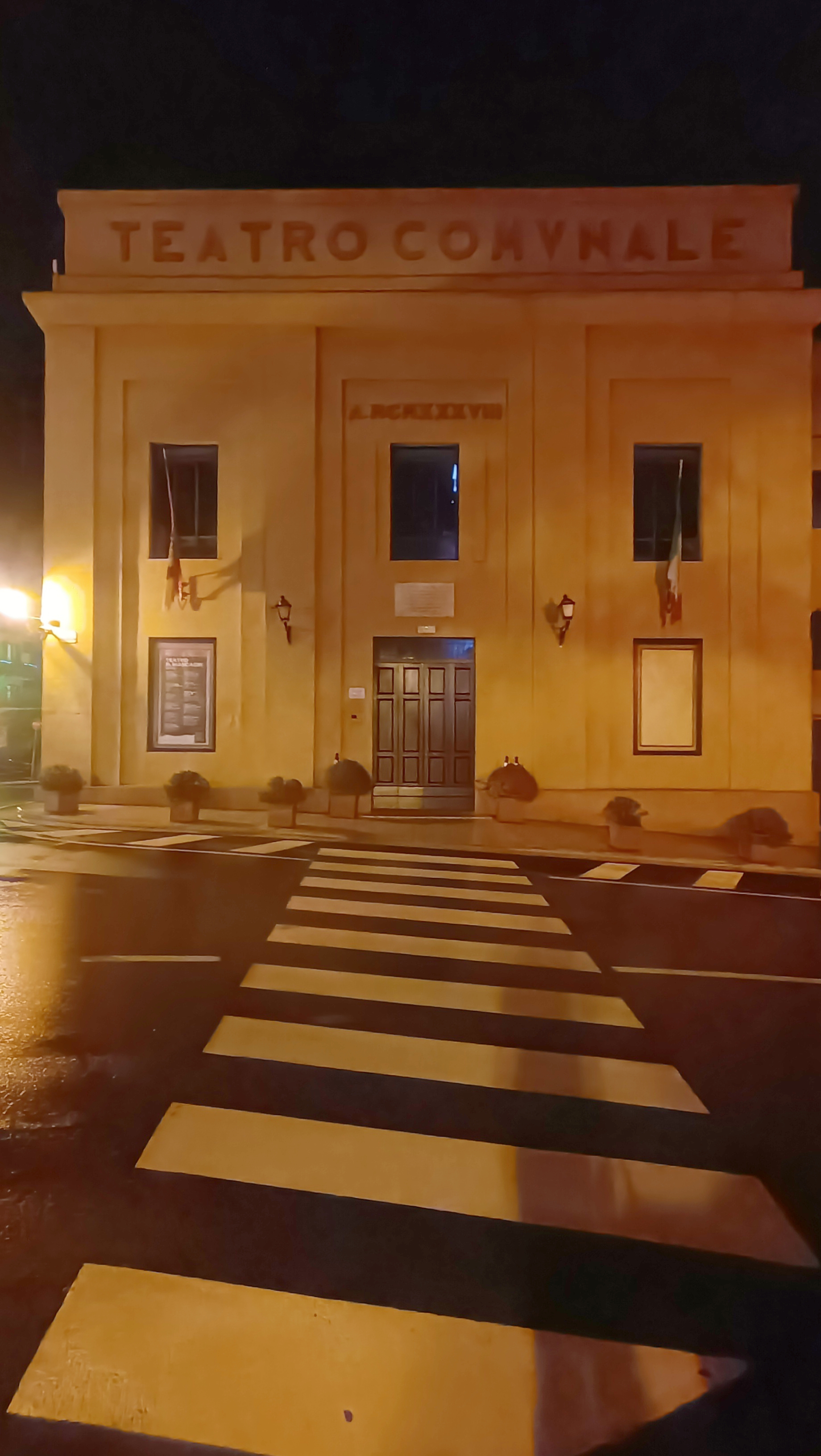 Nessuno in giro. Edilizia fascista qua e là compreso il teatro rigorosamente comVnale che ha un cartellone di tutto rispetto. Una signora romagnola solitaria inveisce contro un locale chiuso al pubblico, dove al suo interno alcuni ragazzi stavano svolgendo dei lavori e dal quale proviene della musica ad alto volume “Chiamo il Sindacoooo io!!!”. Rientro mentre sta iniziando a piovere.