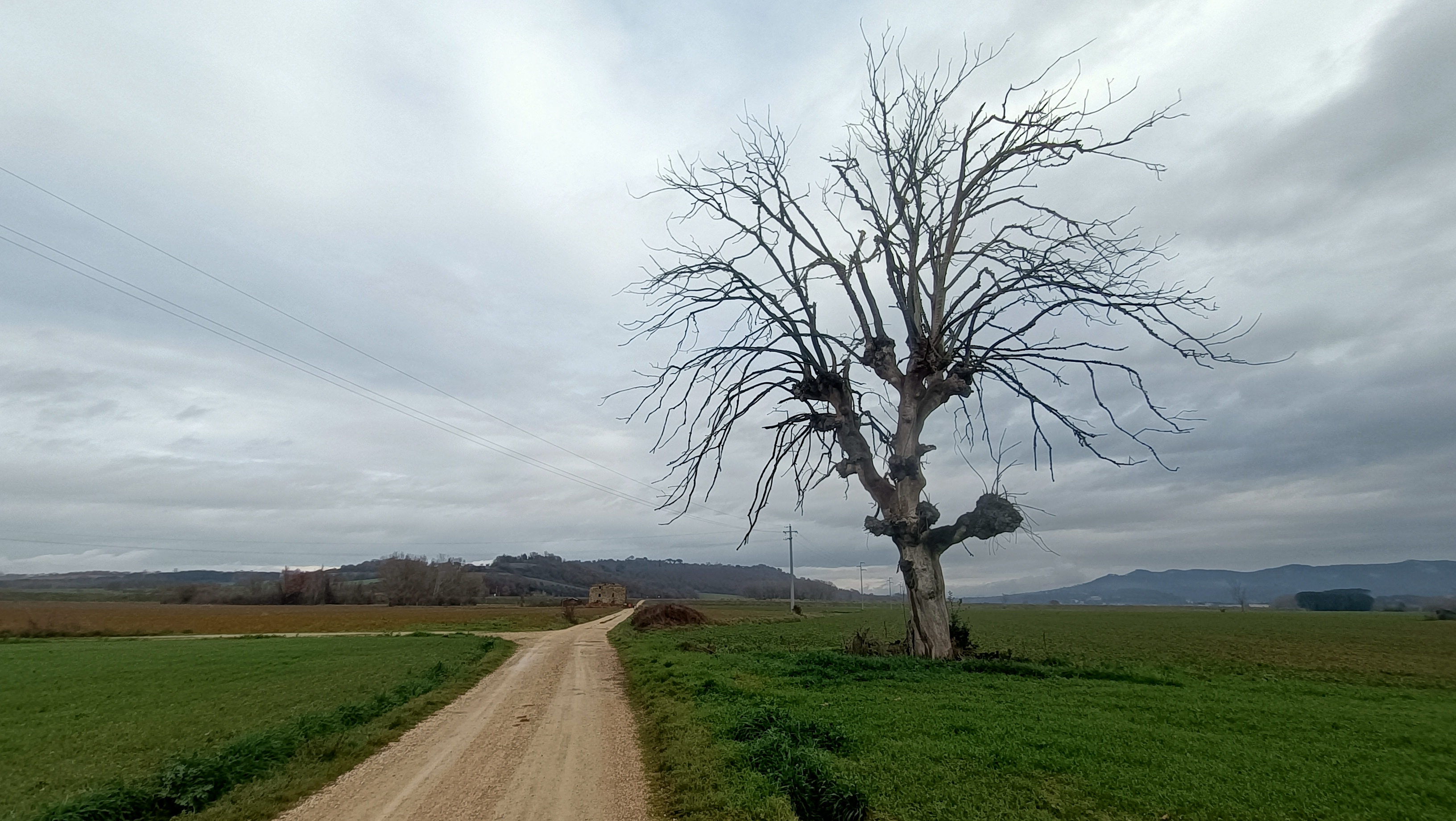 E’ una tappa breve oggi, circa dieci chilometri. Dalla collina dove si trova Chiusi scendiamo verso la pianura, verso Chiusi Scalo che praticamente è il cuore pulsante della cittadina. Qui ci sono supermercati, negozi, la stazione ferroviaria e tutti gli altri servizi che su in collina non hanno ragione d’esistere. Iniziamo a vedere qualche persona in giro. Dopo avere litigato su cosa comprare da mangiare ripartiamo con gli zaini gonfi per trovare il sottopasso pedonale della ferrovia che ci permetterà di ritrovare il segnale arancione del cammino e lasciarci alle spalle questo spicchio di Toscana protesto dentro l’Umbria.