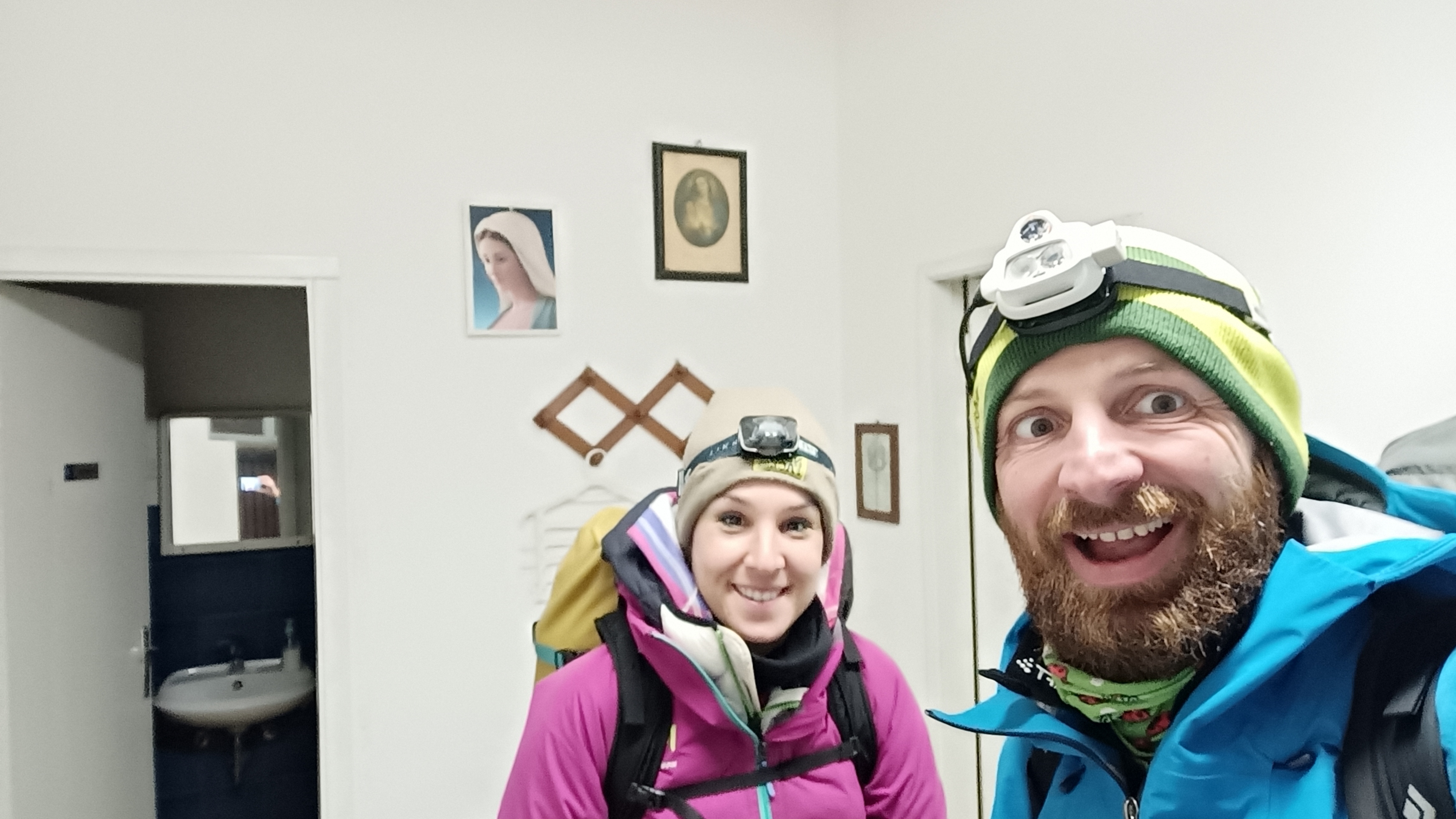 Entriamo dalla porta dell’oratorio a fianco della chiesa mentre la nostra stanza è nel retro. E’ ben pulita ed organizzata. Ci sono due letti rifatti, alcune sedie un piccolo tavolo con una piastra elettrica dove scaldare il cibo. Un mobile con posate, stoviglie, coperte e i pensieri dei pellegrini che sono passati di qui. Il soffitto sarà alto 5 metri e la stufetta elettrica che Don Augusto ci ha fatto trovare accesa pompa come un ossesso ma fa caldo solo standoci davanti.