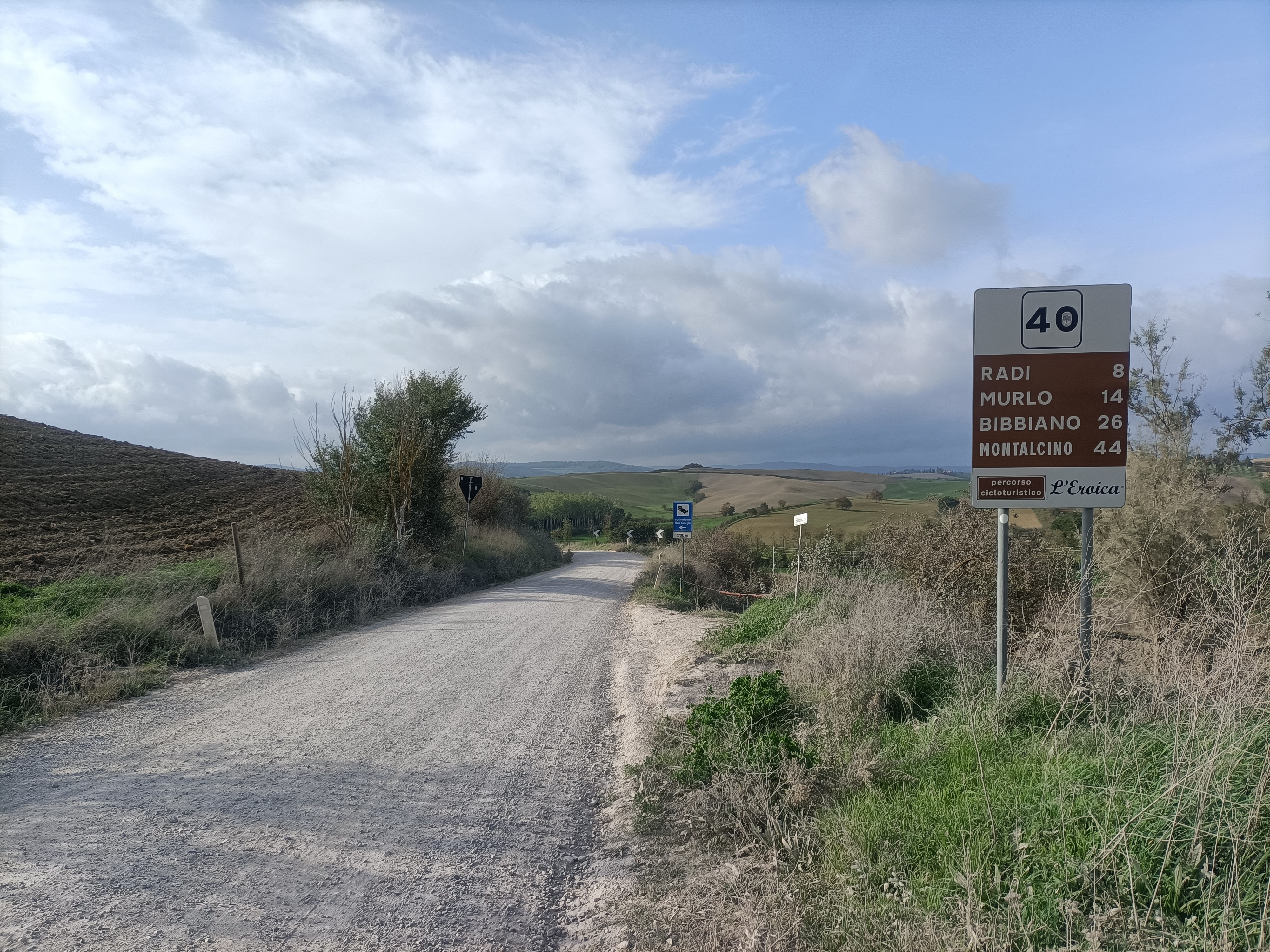 La discesa da Montalcino ci fa capire quanto eravamo saliti il giorno prima. Fra sali e scendi guadagniamo Torrenieri ed il Castello d Cosona. La nostra meta è Lucignano d’Asso, minuscolo paese cui si arriva solo tramite strade bianche. Qui sono ancora presenti, alla parete di un’abitazione, le scritte della propaganda fascista a firma di Mussolini.