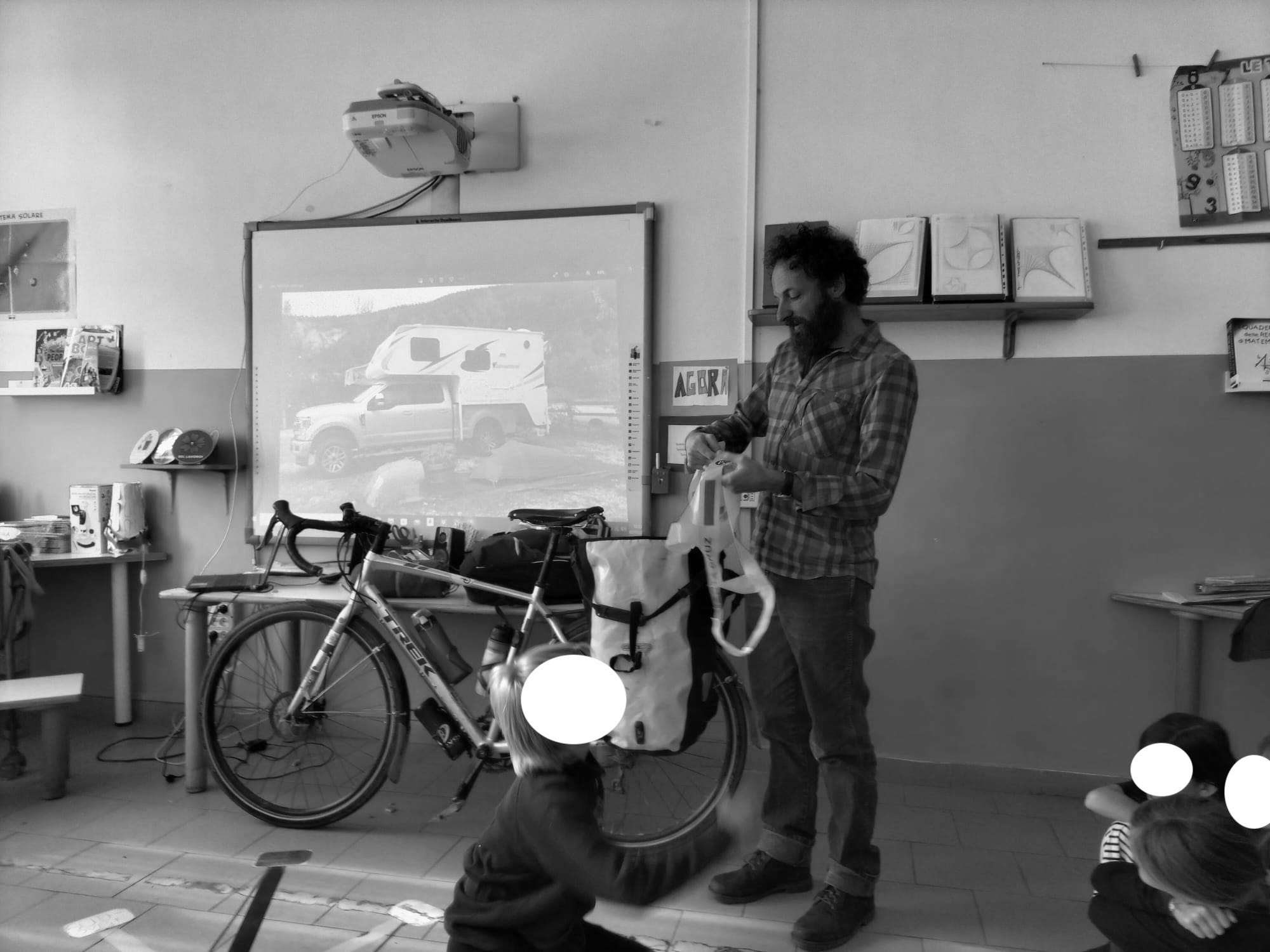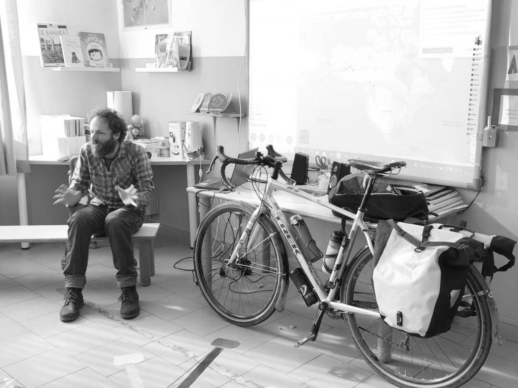 La mattina della presentazione ho portato tutto con me. Bicicletta. Borse. Tenda. Sacco a pelo. Casco. Borracce. Oggetti vari e soprattutto la bici con i suoi graffi come cicatrici e i tanti adesivi come tatuaggi. Poi ho proiettato una cartina geografica ed a seguire alcune foto, e quello che ne è venuto fuori è stato sorprendente.