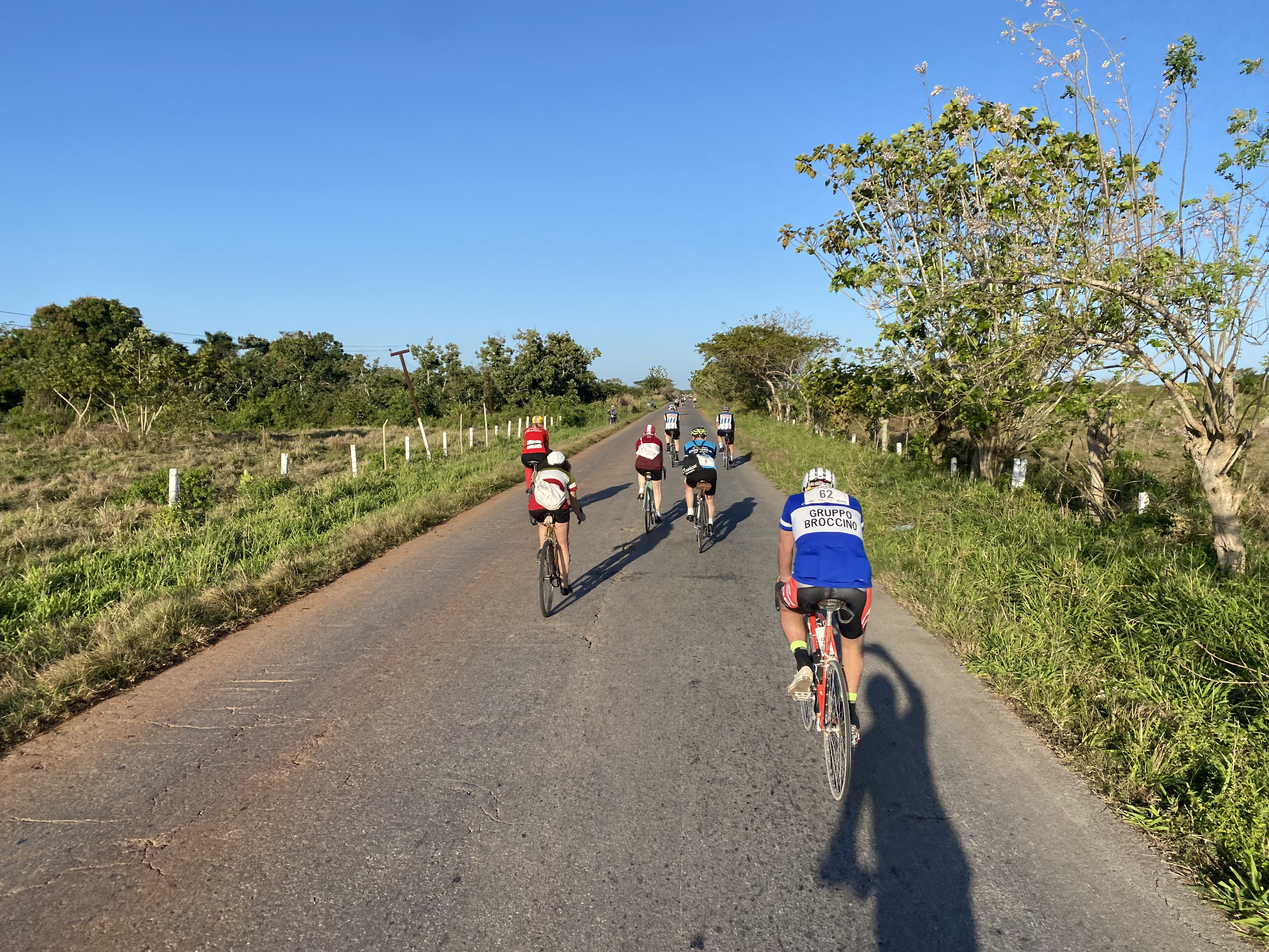 Alle 8 in punto partiamo dopo che Brocci riattizza l’antico fuoco eroico sull’importanza dell’essere presenti qui. Assieme a lui Eduardo Alonso, ex ciclista professionista cubano con successi in Italia e partecipazione a campionati del mondo.