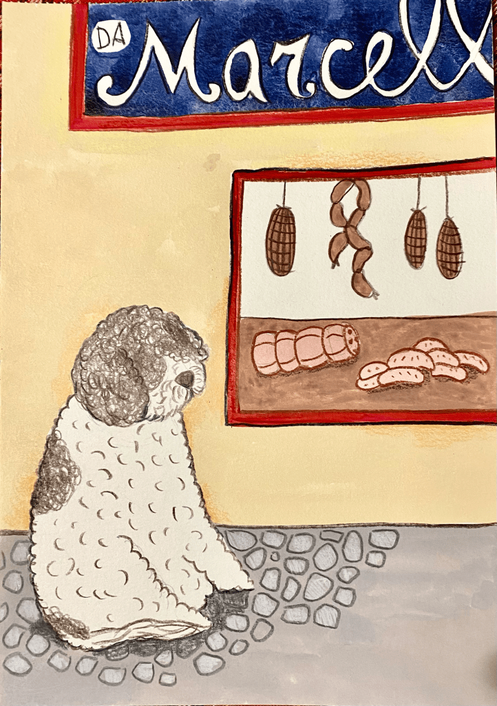 Io davanti alla macelleria di Marcello facevo il palo. Facevo il palo con la scusa che mi piacevano le salsicce ed essendo cane, Lagotto-romagnolo per la precisone, non davo nell’occhio. In questa maniera la mia banda poteva fare il lavoro sporco. Premetto che io nella vita sono stato e sono tutt’ora un cane, pardon un Lagotto molto concreto. Buoni sentimenti sì, ma se non si mangia è un problema. Ma torniamo alla mia banda. La banda era composta da tre elementi: Roger, Gastone detto Gas e Dino trivella.